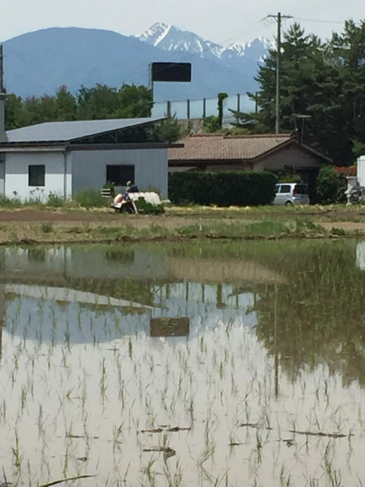 私が自然農で育てる水田です。ちと遠いですが、北アルプス常念岳を借景にしています。小太郎米の誕生です。